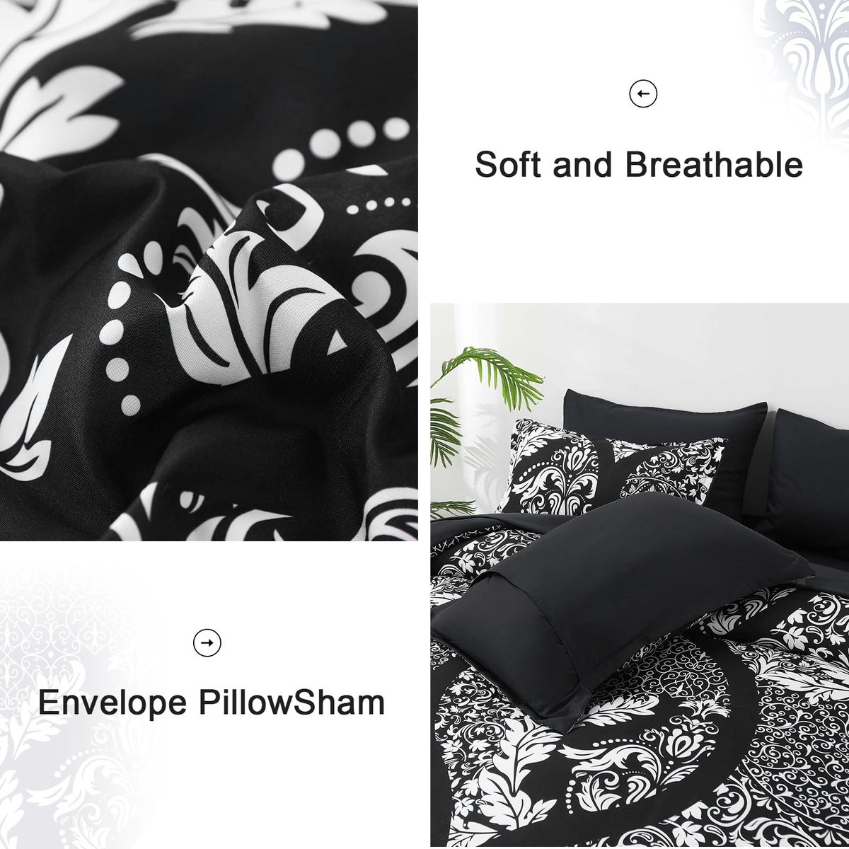 ?7 Piece Bed In a Bag?: Black damask bed in a bag king include 7 pieces. 1 comforter 104" x 90" -2 pillowcases 20" x 36"-1 Fitted Sheet 78"x 80"+14?-1 Flat Sheet 102x 108"-2 Pillow Shams 20"x 40".,?Boho Damask Pattern Design?: Combined with the damask pattern pattern design, black comforter set exudes style and luxury. Add a touch of class to your bedroom with the comforter set?,?Exquisite Workmanship?: king bed in a bag comforter is luxurious elegant bedding, decorating any room in any style. Several invisible stitching prevent the filling from shifting or leaking out, the firm stitching ensures it will last for years to come. Envelope pillowcase is easy to remove and wash.,?Soft Lightweight?: Damsk comforter king is made from high quality microfiber makes the comforter soft touch, lightweight breathable. and fluffy, Providing you all-year round healthier sleep quality.,?Easy to Care?: Lightweight comforter sets is machine washable. Machine wash cold separately, gentle cycle, tumble dry low. No ironing or dry cleaning required.