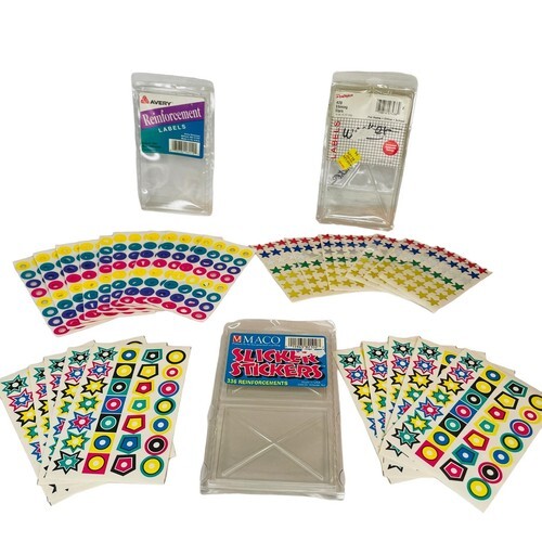 Vtg Maco Avery Pentapeo Reinforcement Sticker Labels Lot Bright Colors Foil Stars. Vintage PREOWNED stickers in original packaging- incomplete. Se below for details. See all photos!
