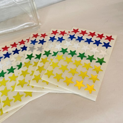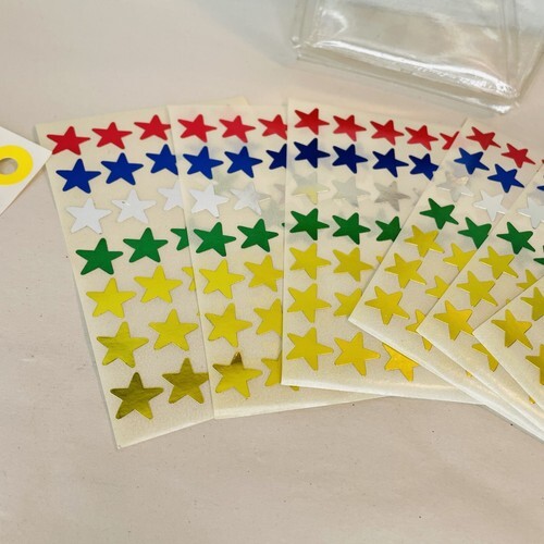 - Pentapeo Gold Foil Green, Red, Blue, Silver, and Gold Shining Stars. 6 unused sheets of 35 = 210 labels. A total of 778 labels. Two green and silver stars are stuck together as shown.