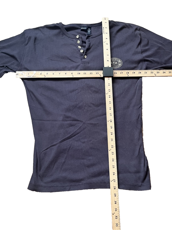 Vintage BUM Equipment T Shirt Men's Henley Neck Blue Short Sleeve Size M Ribbed