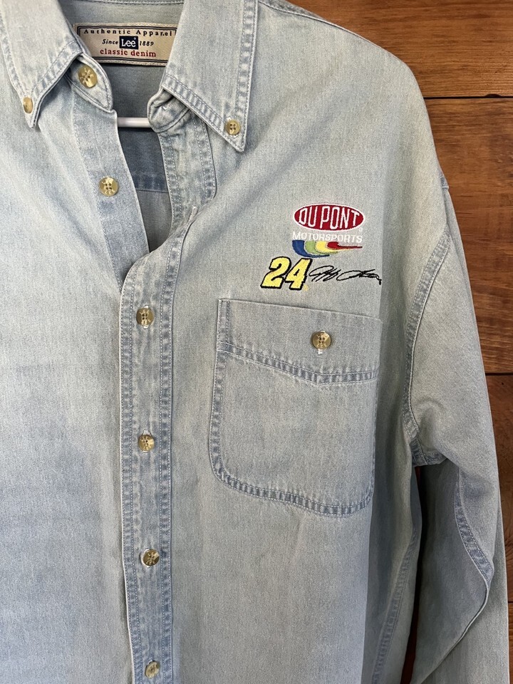 The product is a Lee brand Nascar Dupont #24 Jeff Gordon blue long sleeve denim shirt made of cotton. This shirt is designed for men and features Jeff Gordon as the driver for the Hendrick Motorsports team in NASCAR auto racing. It is an official fan apparel and souvenir item for NASCAR events and tournaments, specifically showcasing Jeff Gordon's racing number and team. The shirt is a must-have for fans of Jeff Gordon and Nascar racing.