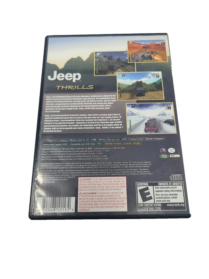 The product is a complete Playstation 2 game called Jeep Thrills, released in 2008 by Destination Software. It falls under the racing genre with a sub-genre of car racing. The game is rated E for Everyone and includes a manual. Set in the NTSC-U/C region (US/Canada), players can enjoy exciting car racing gameplay with the iconic Jeep vehicles. Perfect for fans of off-road racing and adrenaline-pumping gameplay, this game offers hours of entertainment on the Sony PlayStation 2 platform.