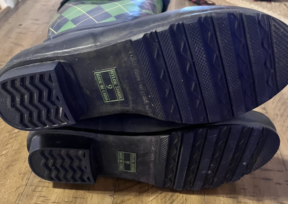 The LL Bean Wellie Rainboots in women's size 9 and mid-calf length are a stylish and functional choice for casual occasions. These blue green plaid boots are lined for added warmth during the winter season. Weighing only 1 inch at the platform height, these rain boots are comfortable for all-day wear. Made with a rubber outsole and upper material, they are a durable and practical option for those looking for a trendy yet practical footwear choice. Perfect for the outdoor activities or a rainy day, these LL Bean Wellie Rainboots are a versatile addition to any woman's shoe collection.