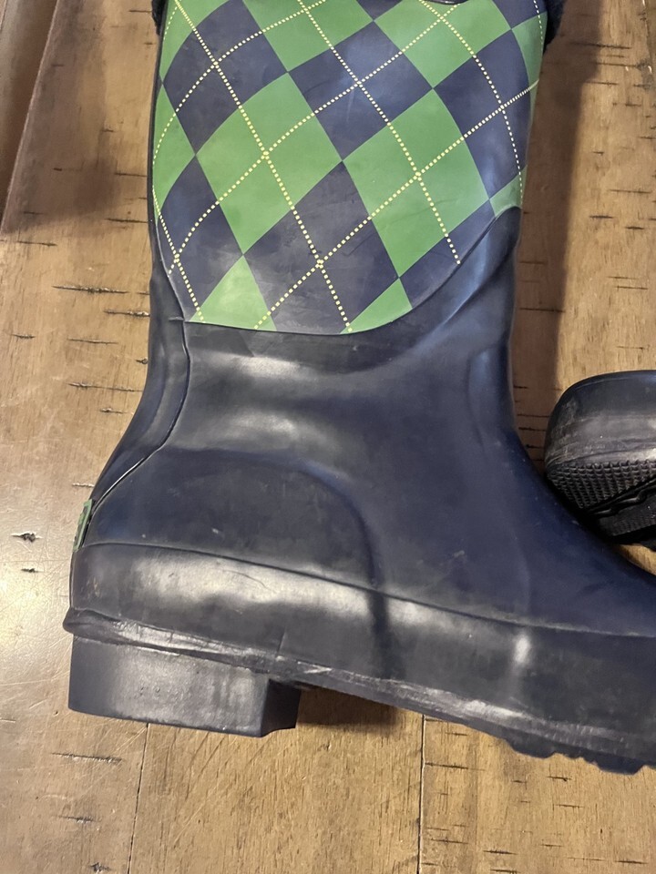 LL Bean Wellie Rainboots Womens 9 Blue Green Plaid Mid Calf Lined
