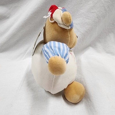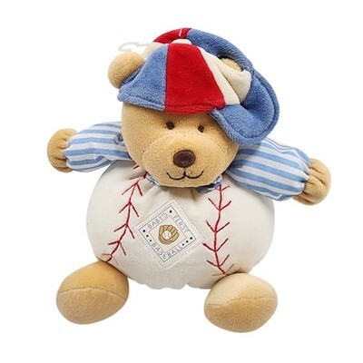 Keywords: Nursery decor, sports theme, infant toy, collectible plush, vintage style, blue white stripes, red stitching, soft toy, baby boy gift, keepsake