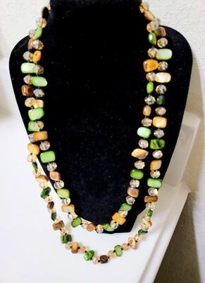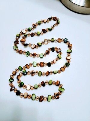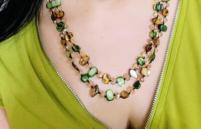 This necklace features a long length design, perfect for adding a bohemian touch to any outfit. Crafted with green and gold beads, it offers a unique blend of colors that complement stylish outfits. Ideal for those seeking a distinctive accessory to enhance their look.