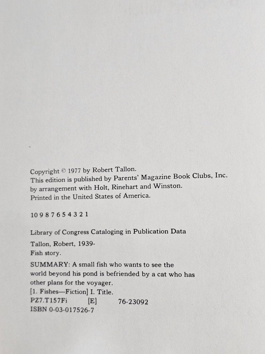 item: Fish Story by Robert Tallon, originally published in 1977. This edition was published by Parents? Magazine Book Clubs, Inc. by arrangement with Holt, Rinehart and Winston.