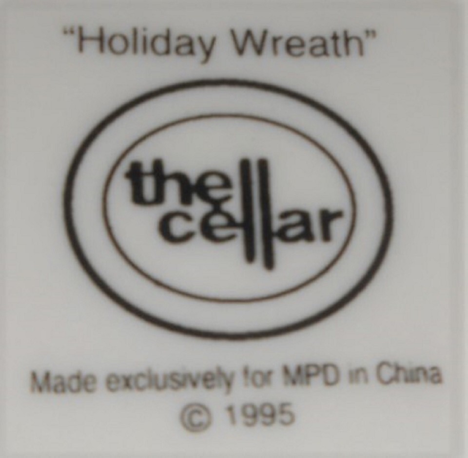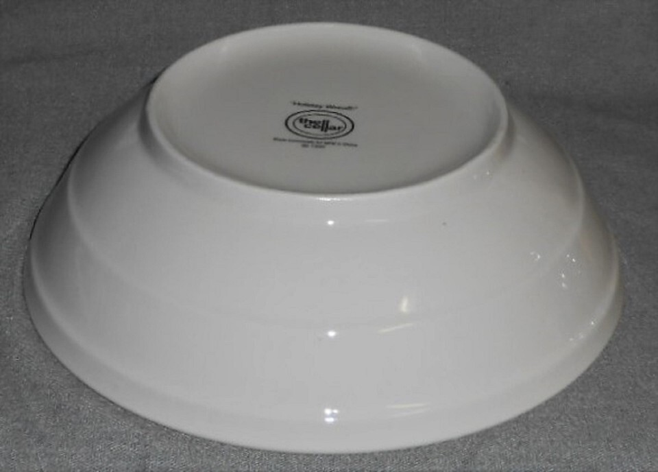 This is the 9 3/8" Serving or Vegetable Bowl from The Cellar in the Holiday Wreath Pattern - circa 1995. It is in good pre-owned condition with no chips or cracks - has a few utensil marks present. .