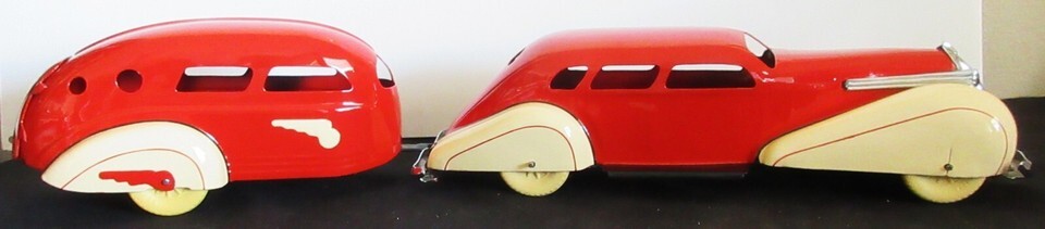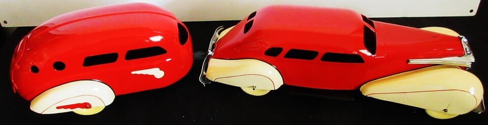 An original metal model of a Wyandotte metal car with a matching Air Stream Trailer, circa 1930's