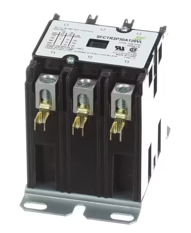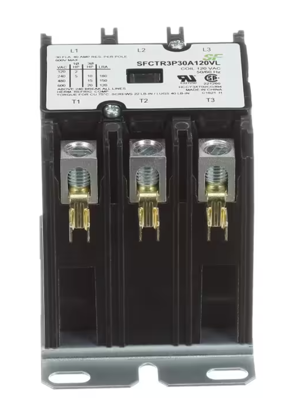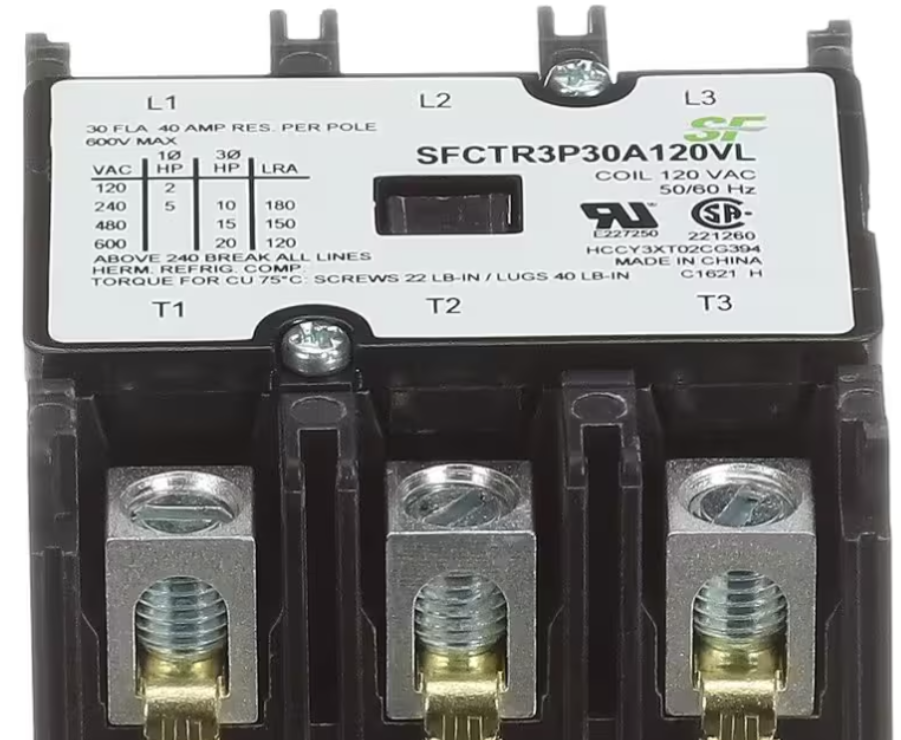 The Trane SFCTR3P30A120VL 3 Pole 30A Contactor delivers dependable electrical switching essential for consistent HVAC performance. Its precise voltage compatibility, robust construction, and secure lug connections ensure stable operation, minimize downtime, and support long-term reliability in commercial and residential heating and cooling systems