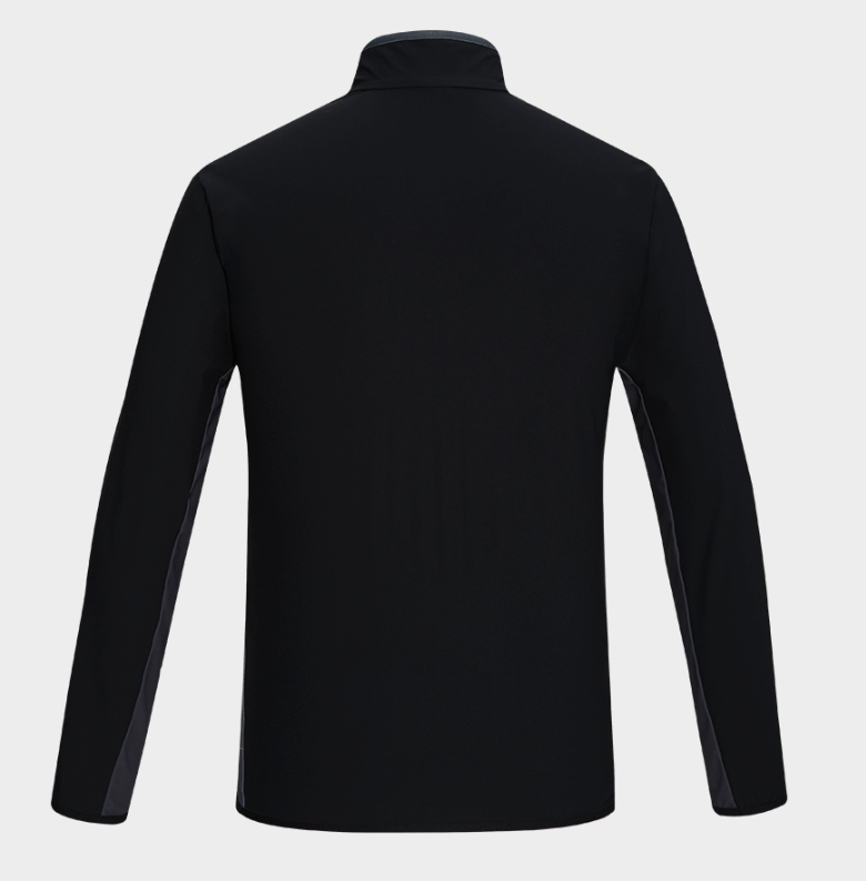 Features : A wearable woven training top featuring a black base with gray-toned color-block accents for a clean, sporty look. Elastic binding at the collar, sleeve cuffs, and hem helps provide a secure, comfortable fit. An embroidered detail at the lower arm adds a simple finishing touch.
