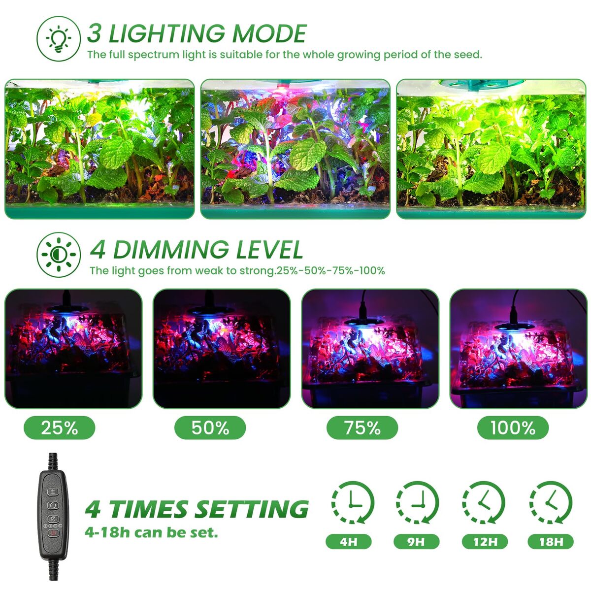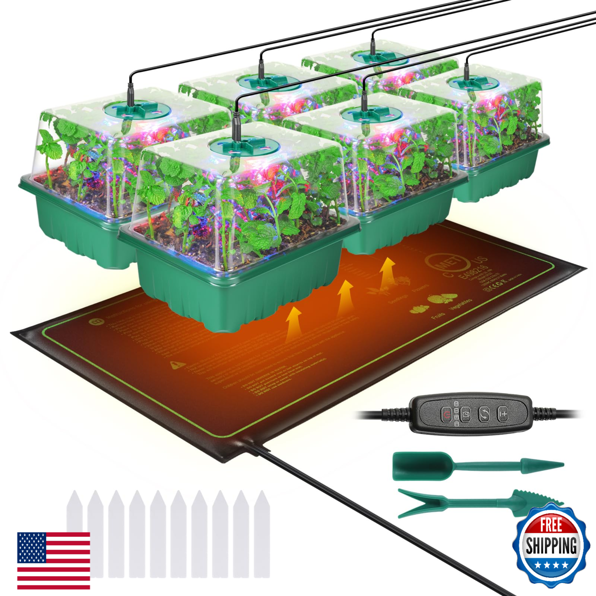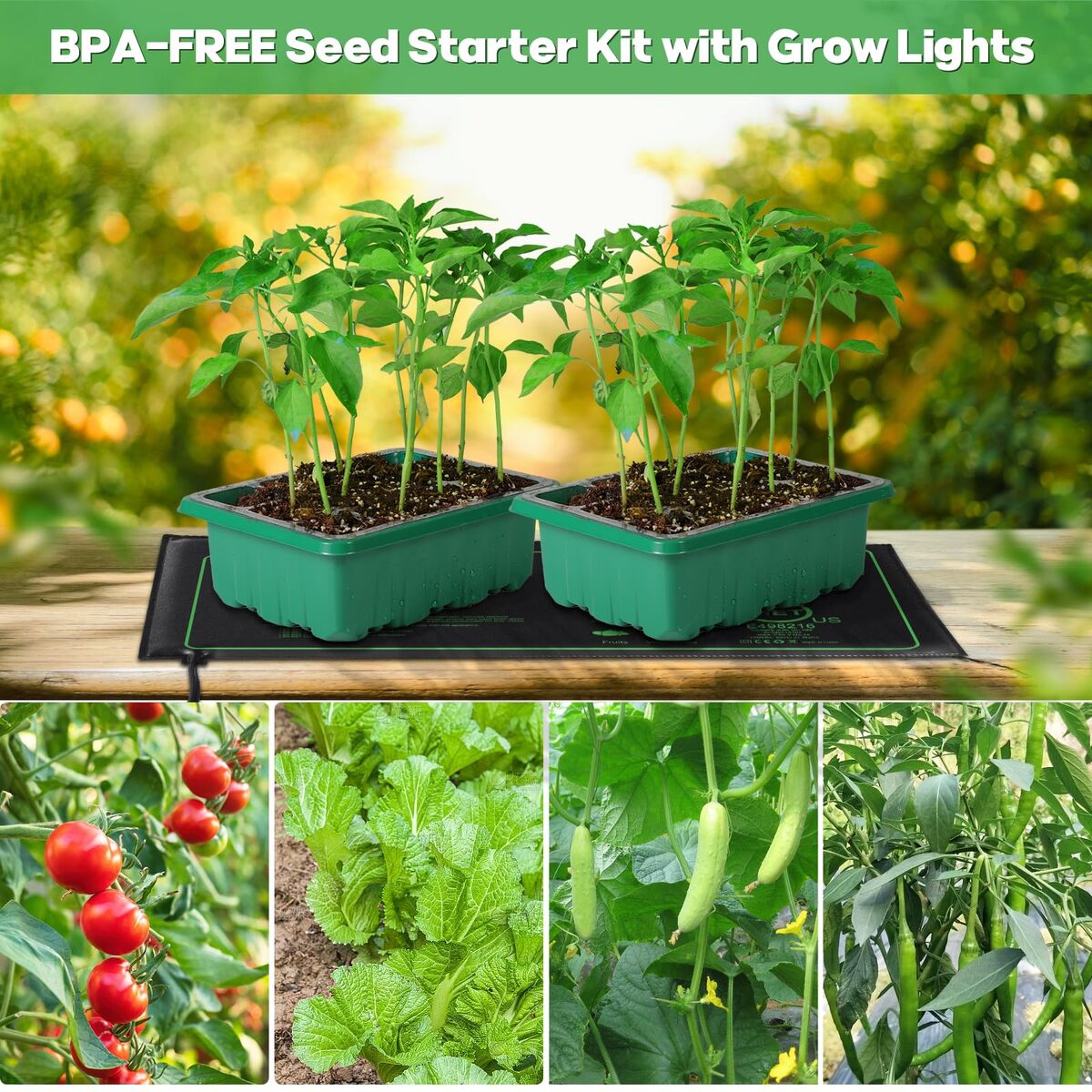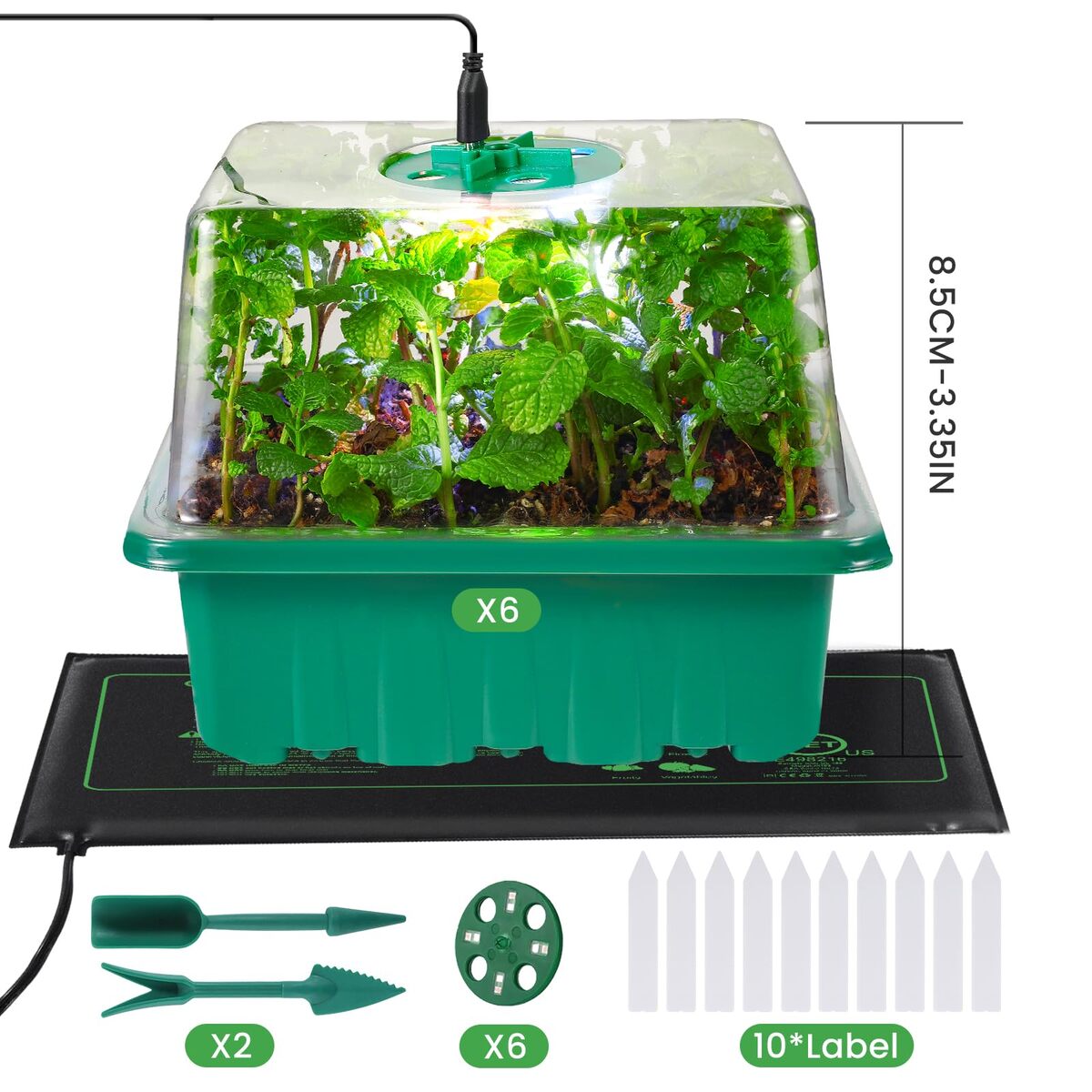 [ Value Seed Starter Kits]: It includes: 1* heat mat for seedling start, 6*12 cells seedling trays and 6 grow lights. Which can provide lights and heat to the seedlings. There are 3 lights: white light, blue light, red light. It is suitable for starting seedlings that love lights. Such as: basil, rosemary, mint, herds, tomatoes, pepper shoots, strawberries, etc.,[3 Lighting Modes]: Different from other growth lights that can only provide white light, we have doubled the light bead and switched the light mode function, a total of three lighting modes: 1. White light; 2. Blue + Red Lights; 3. White + blue + red Lights. The addition of blue and red light can promote the root growth of seedlings. Blue light can inhibit the long legs of seedling, and red light plays an important role in stems and leaves, as well as flowering and fruit.,[Speeds Up Germination and Improves Propagation]: Using the waterproof seedling heat mat growing environment to promote seedling germination and improve seedling rooting without overheating your plants. The maximum temperature when stable is about 90-100 degressa Fahreheit. Instructions and growing tips are printed right on the mat. At 21 watts, it uses very little power.,[Well-Builted Construction Seed Trays]: High-quality plastic is reusable, recyclable. The seed starter trays are divided into equal 1.6" squares in 1.97" depth for your small or large seeds for flowers, vegetables, fruits, succulents and other plants. It is designed with the proper size holes to allow drainage, while the bottom seedling trays retains overflow water to prevent leaking.,[Adjustable Humidity Design]: Our transparent domes have a adjustable circular vents, Adjustable humidity from 50-100%. we can easily adjust the inner humidity and temperature by rotates the regulator to accommodate different stages of seed to seedling growth, promote air circulation and help seed growth.