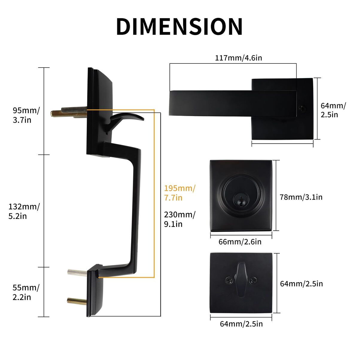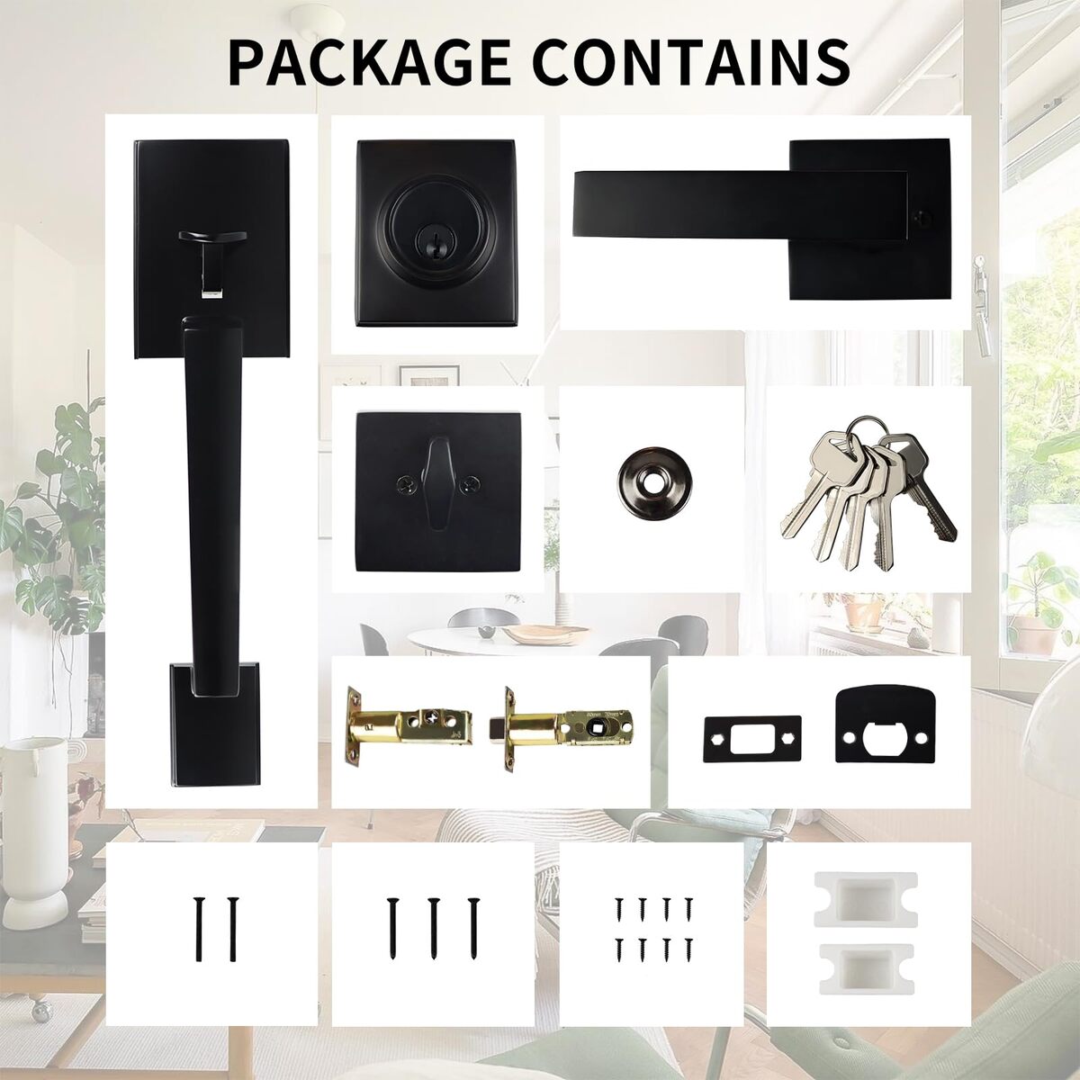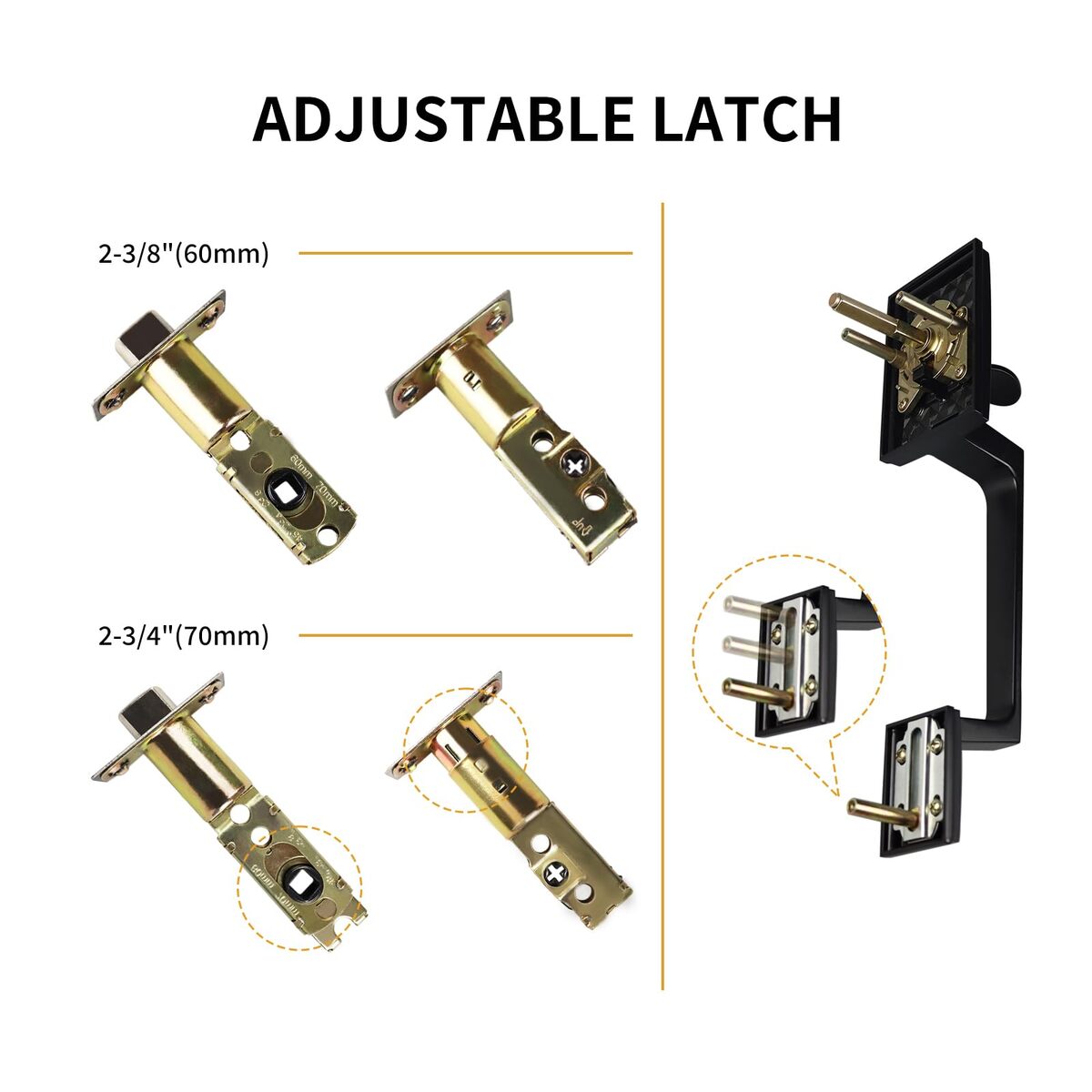 ?Safety Door Handle?The door handle kit is made of high-quality materials, which are sturdy and not easy to break. The matte black surface is suitable for most decoration styles and is resistant to rust and corrosion. The door lock is not easy to loosen, more reassuring in daily use.,?Adjustable Latch?The length of the latch can be adjusted within the range of 2-3/8(60 mm) to 2-3/4(70mm)inches, suitable for different hole spacing. The applicable door thickness range is 1-3/8 inches to 2 inches. It is firm and not easy to fall off after installation.,?Reversible Design?The front door handle set is reversible and can be installed on either the left or right handed doors. The flexibility of this design allows the deadbolt lock set to adapt to different door layouts, giving you more convenience.,?Wide Applications?Square front door handle set, simple and classic appearance design, can be well integrated with various decoration styles, such as modern minimalist style, European retro style, etc., suitable for office, residence, etc.,?All Accessories?Our door handle set provides you with sufficient security, and the door handle kit comes with necessary installation hardware. You don't need to purchase additional installation accessories, just use a screwdriver to install in a few minutes.