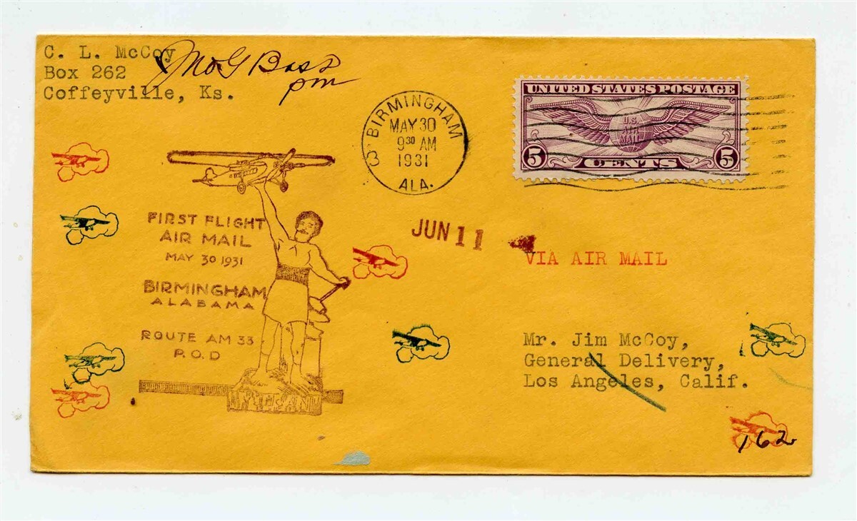 A First Flight Air Mail Route AM 33 on May 30, 1931, with Birmingham Cancel on the front. 1931 First Flight Cover AM 33 Birmingham Alabama to Los Angeles California. In fine condition.