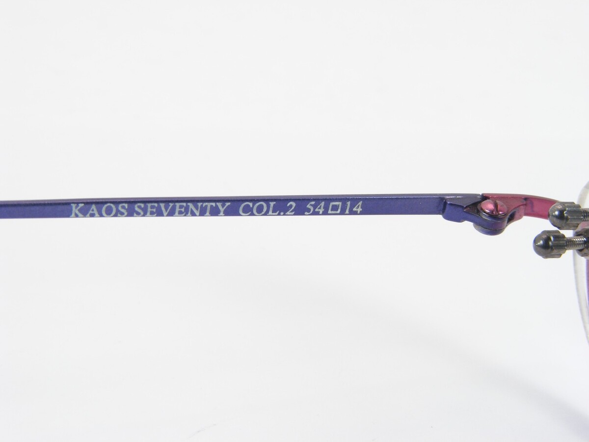 KAOS SEVENTY 2 Purple Blue Gradient Pink UNIQUE RARE EYEGLASSES FRAME 54-14-135mm. (N756) Notes: no scratches on the frame / there are reflections from the photo lamps Kaos astonishes and transforms traditional design through a kaleidoscope of colors and accelerated sensations. This line presents an image between reality and fiction almost reminding one of a character in a futuristic comic. Style and comfort in everyday use. A pair of glasses is not just an accessory; it provides the first hint of an individual?s personality. The wearer must enjoy a frame and feel that it is completely consistent with his or her look and mindset. A great pair of glasses, with all its detail and complexity must above all be an extension of the individual. Returns are always FREE for any reason. If you do