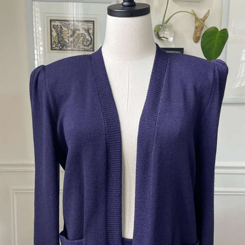 St. John 2-piece Santana knit purple skirt suit, including an open front jacket with pouf shoulder and pencil skirt. Laying flat the waist measures 13.5 inches straight across when relaxed stretching to 16 inches without much resistance. 25.5 inches long. Made for Saks Fifth Avenue. The jacket has shoulder pads and measures 24.5? shoulder to hem and 19? armpit to armpit with a couple inch gap in the front opening. Tag size 8. Please use the measurements as your guide. In my opinion, it runs a little small based on modern expectations, but Santana knit is stretchy. no holes or snags noted.