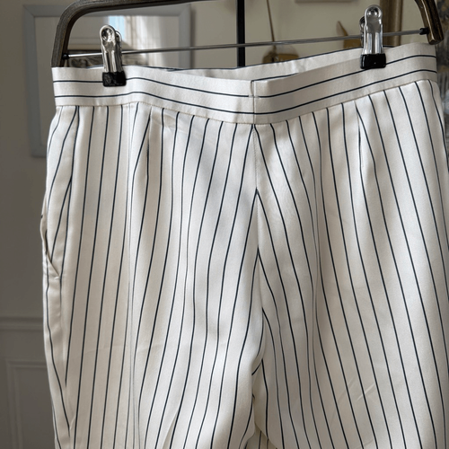 Vintage Ralph Lauren black label 100% silk lined straight leg ankle trousers. Preppy, classic, old money, timeless. Double hook and zip closure with hip pockets. Ivory with dark blue striping. Lined. Tag size 6. Laying flat measures 14.5 inches straight across the waist with a 9.5 inch rise and a 27.5 inch inseam. No noted flaws. Made in Hong Kong. This line retails in the $1000s for separates