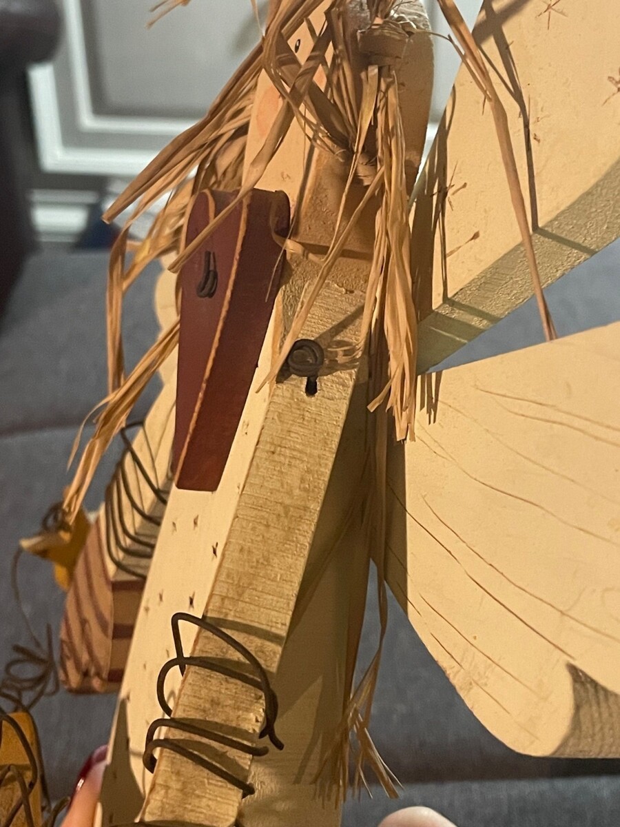 Pre-owned in good condition. Light surface wear consistent with age and rustic farmhouse style. There are minor spot markings and small worn/chafed areas on portions of the lower legs/feet and hand areas from normal handling and display. Raffia detailing shows natural fraying as expected with primitive decor. No cracks, breaks, or structural damage. All wooden accents and wire details are intact. Please review all photos carefully for full condition details.
