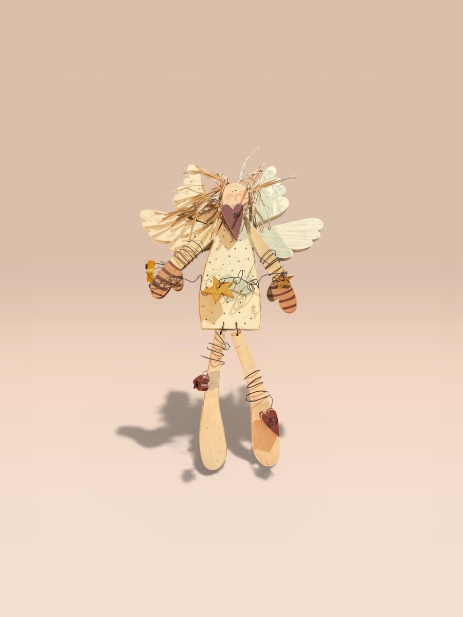 This decorative wall plaque features a beautifully crafted wooden angel with dimensional wings, dangling legs, wire accents, a heart detail, and raffia embellishments that enhance its country folk art appeal. The distressed painted finish and handcrafted look make it perfect for farmhouse, cottagecore, country, or primitive decor themes.