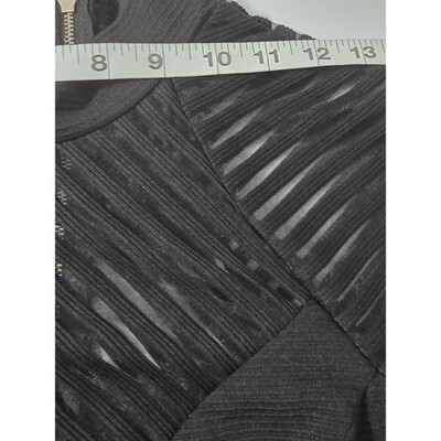 Bodycon silhouette in a sleek black textured knit features striking mesh paneling throughout the bodice, waist, and hem. Designed with a sophisticated high mock neckline and long sleeves, this dress offers a modern, edgy aesthetic with its geometric striped mesh inserts that create a semi-sheer effect. A full-length exposed silver-tone zipper at the back adds a bold metallic detail while ensuring a secure fit. The structured fabric provides a flattering, form-fitting shape perfect for evening events or a night out.