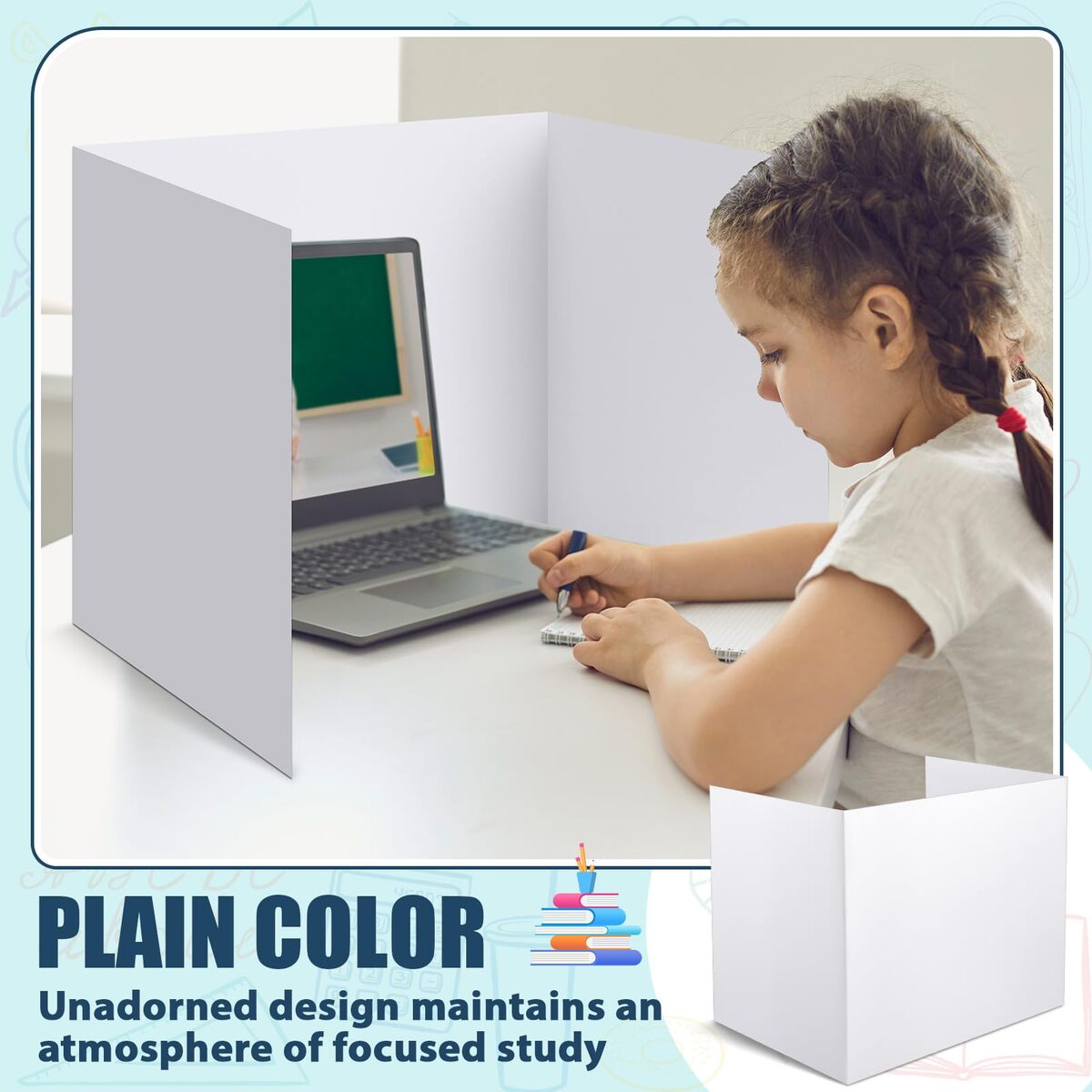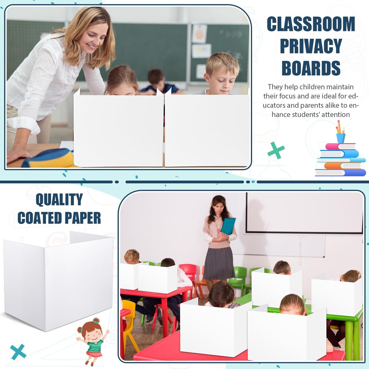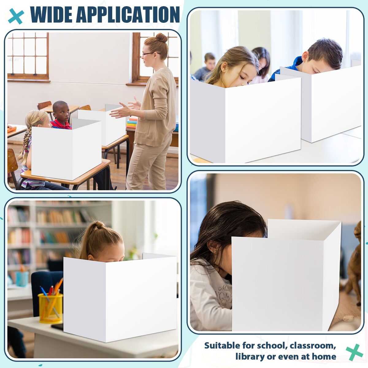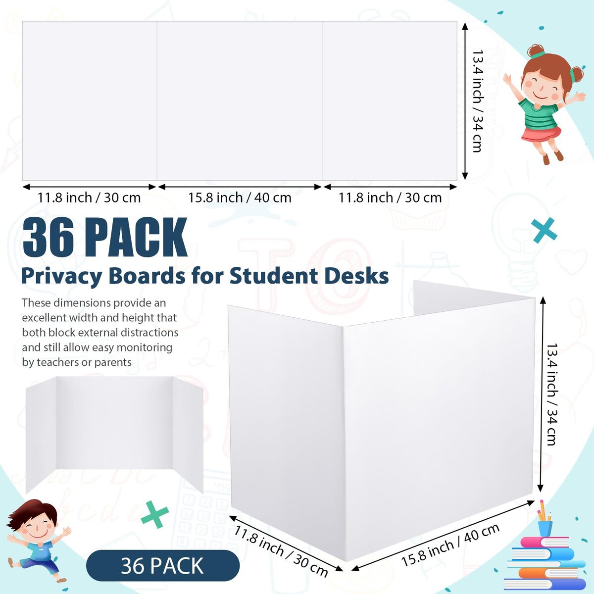 Comprehensive Package: the set includes 36 classroom privacy folders, ensuring enough pieces for a full classroom or for multiple study spots at home; These dividers meet daily use and replacement needs at educational institutions or home schooling environments, encouraging students to stay focused and productive,Proper Size: the dimensions of each center panel of the testing dividers are approximately 15.8 x 13.4 inches/ 40 x 34 cm while the 2 side plates are approximately 11.8 x 13.4 inches/ 30 x 34 cm; These dimensions provide an excellent width and height that both block external distractions and still allow easy monitoring by teachers or parents,Plain Color: the privacy boards come in a plain white color; The unadorned design maintains an atmosphere of focused study, assisting students in avoiding unnecessary distractions,Quality Material: crafted with quality coated paper, the desk dividers are sturdy and durable; They can stand stably on the desktop, and they are not easy to deform or fall; When not in use, they can be folded in a compact three fold design for convenient storage, ensuring longevity and repeated use,Wide Application: these privacy boards for student desks are suitable for a variety of attention demanding scenarios such as in a school, classroom, library or even at home; They help children maintain their focus and are ideal for educators and parents alike to enhance students' attention