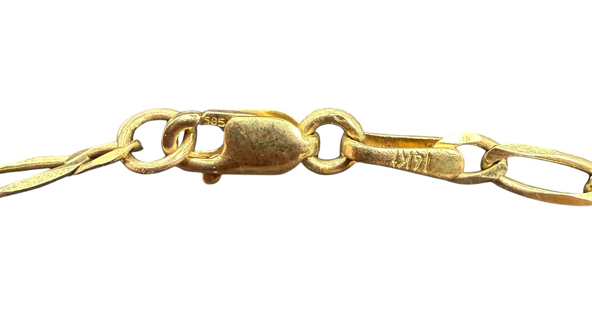Type: ChainWeight: 2.7Karat: 14ktMetal: Yellow GoldGender: UnisexStyle: FigaroSize / Length: 22"Owner applied: 14KtCondition:Used