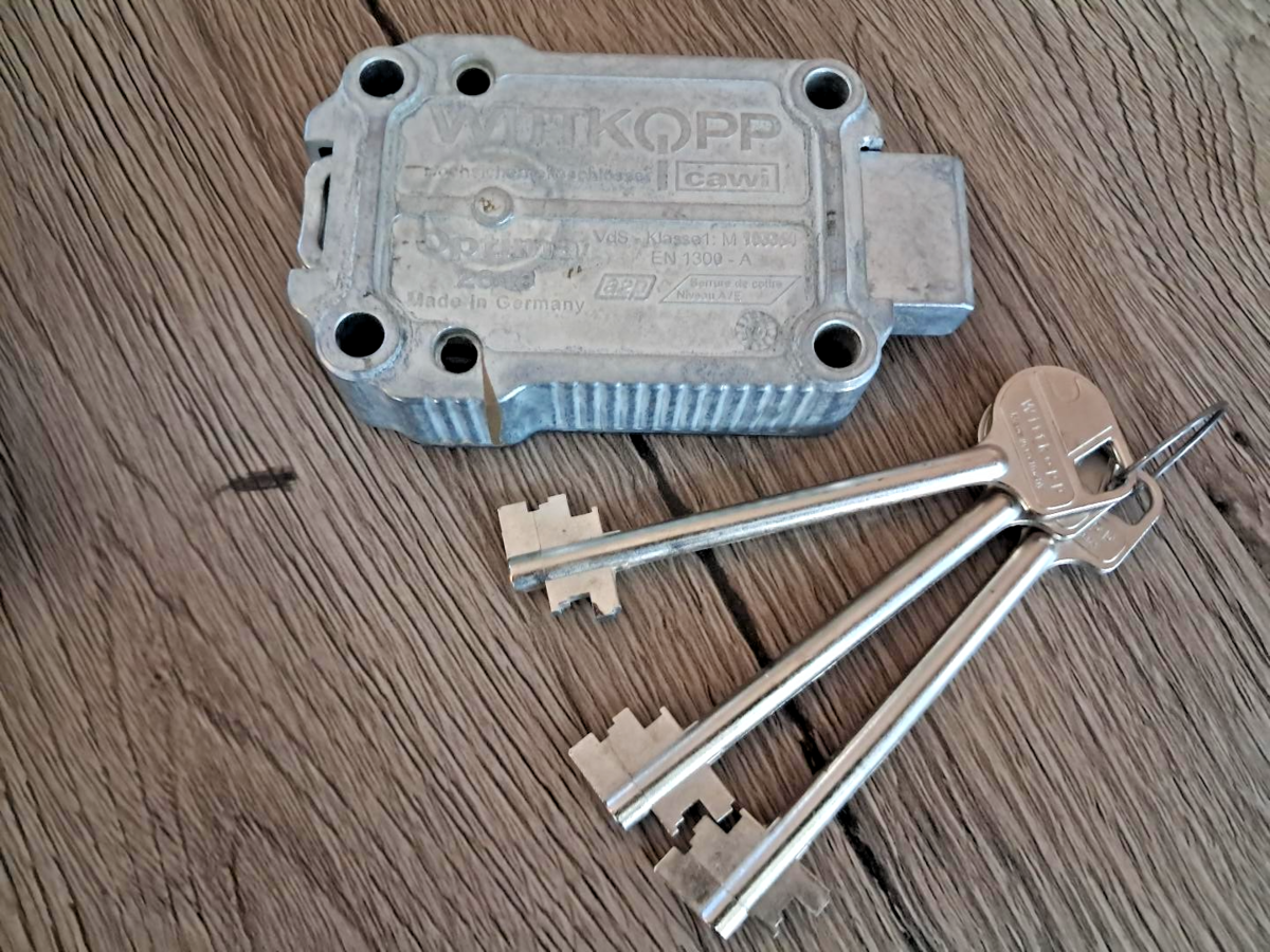 Serrures a cle de securite Wittkopp Optima serie 2648 avec trois cles de 3" chacune. Etat neuf, retire des nouveaux coffres-forts lors de la conversion en verrouillage numerique. Serrures de securite VDS classe 1.