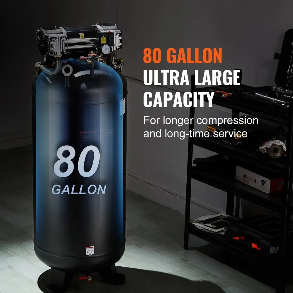Massive 80-Gallon Capacity: Ensure extended air supply with our 80-gallon large capacity! VEVOR air compressor meets the long-term air needs of your production, enabling smoother workflows, minimizing downtime, and maximizing productivity