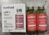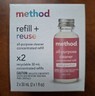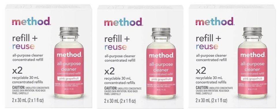 Description of item: This listing includes three packs of Method All-Purpose Cleaner concentrated refill in the Pink Grapefruit scent. Each pack contains two 30 mL (1 fl oz) recyclable concentrated refill bottles, for a total of six refill bottles included. Designed for use with Method refillable spray bottles, simply mix each concentrate with water to create a full bottle of plant-based all-purpose cleaner. The refill + reuse system helps reduce plastic waste while delivering effective cleaning power for kitchens, bathrooms, counters, and everyday household surfaces. All items are brand new and factory sealed.