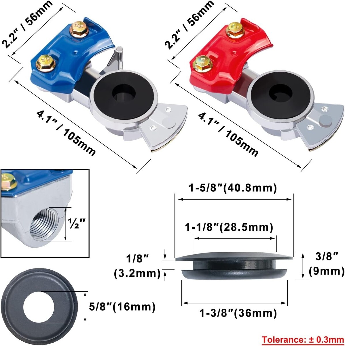 DIMENSION: Connect size:1/2 inch FPT port.Gladhand:105 x 56 mm / 4.1 inch x 2.2 inch ,please check the image