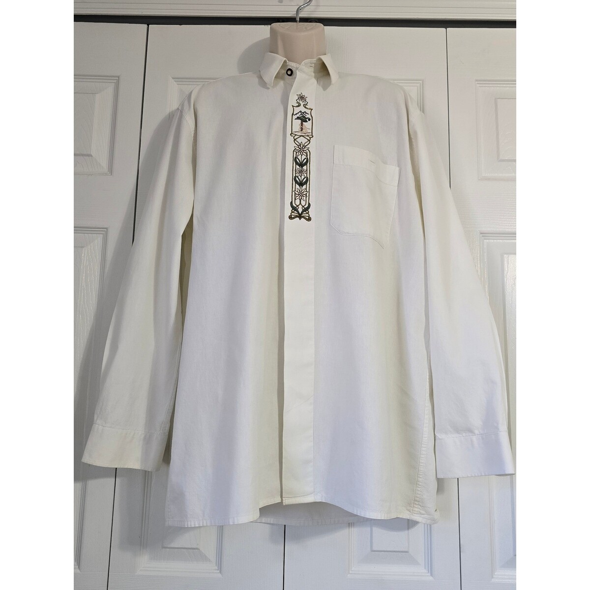 Keywords: Bavarian, Austrian, Folk, Edelweiss, Mountain, Heritage, Traditional, Oktoberfest, European, Cottagecore, Gorpcore, Minimalist, Embroidered Shirt, White Button Down