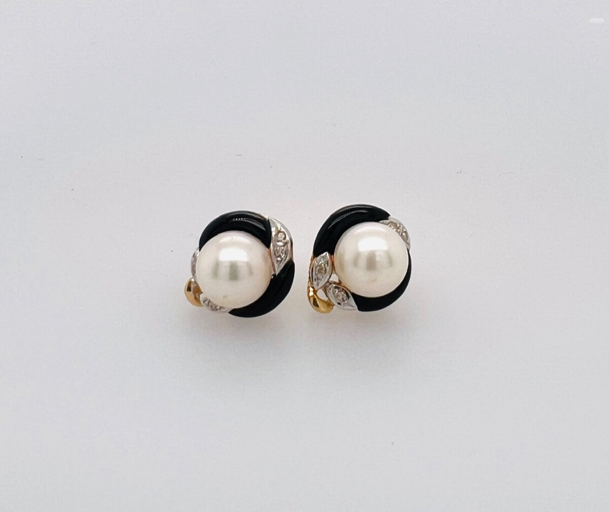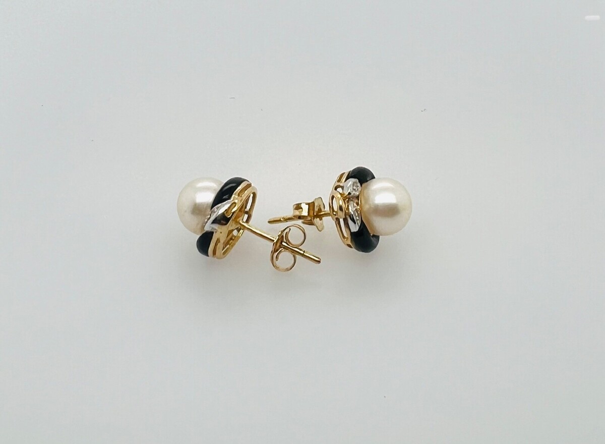 18K Yellow Gold Mother of Pearl & Diamond Vintage Push Back Enamel Earrings