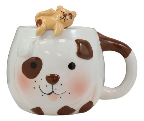 This animal mug with latching spoon set is double walled for higher durability, better handling and ease of cleaning. This whimsical mug features a white tramp dog face with chocolate spots and freckles along with its fat body behind its head. The mug is accompanied by a latching spoon with a sleeping puppy handle top. When attached to the mug's rim edge, the puppy on top of the spoon appears to be in complete relaxation with its legs hanging down the top loosely.