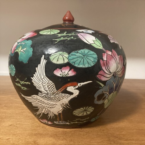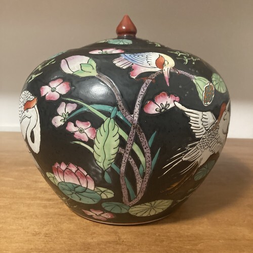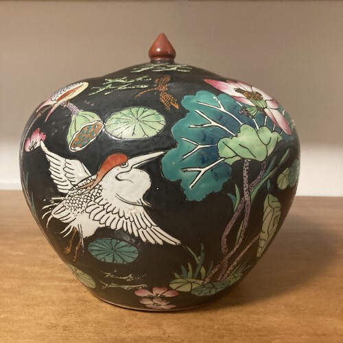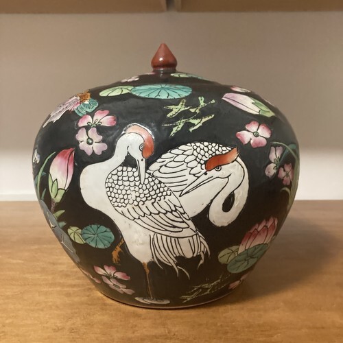 Vintage Chinese Lotus Leaf And Heron Motif Lidded Ginger Jar