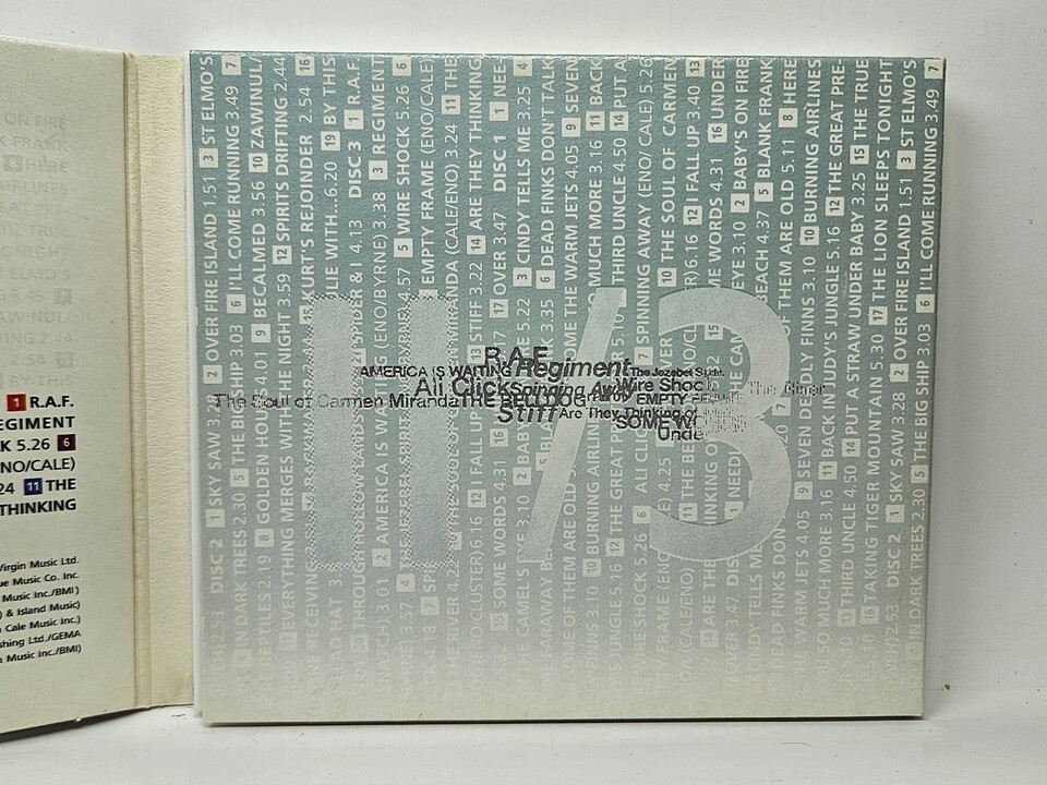 This collection offers a deep dive into Brian Eno's pioneering artistry, encompassing a range of his vocal-centric compositions. It includes tracks such as "America Is Waiting" and "Regiment" from his iconic collaboration with David Byrne, 'My Life in the Bush of Ghosts', alongside works with John Cale like "Spinning Away" and "Empty Frame". Also featured is the previously unreleased track "Some Words" from 1993, making this a valuable addition for collectors and fans of ambient, electronic, and avant-garde music. The disc itself is stamped 'Made in the U.K.', indicating its origin.