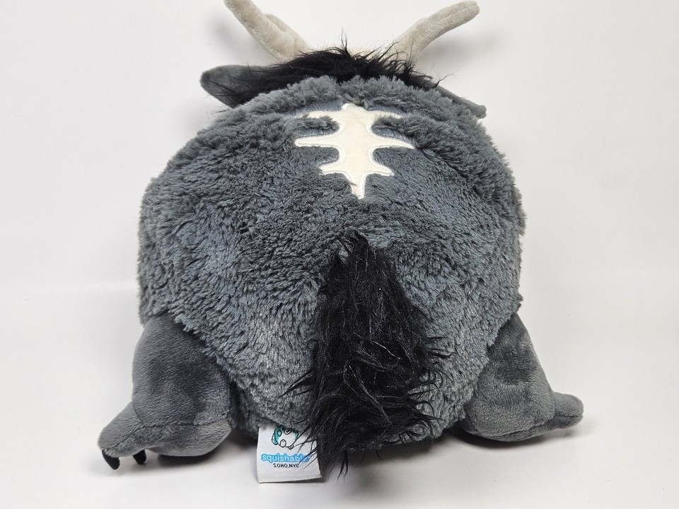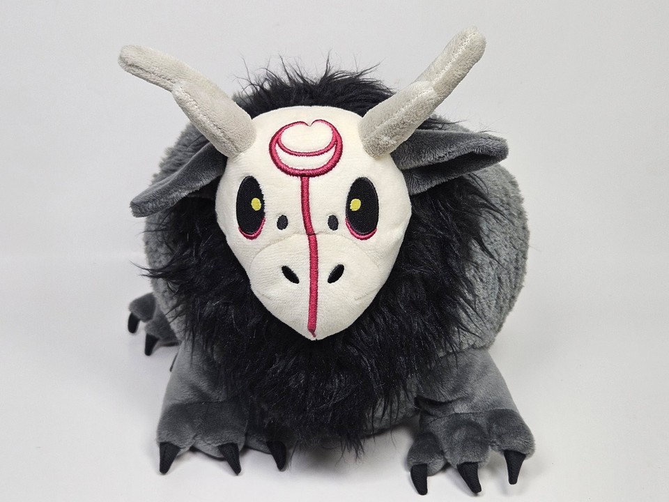 Discover the enchanting Squishable Forest Spirit plush, a magnificent beast creature that will capture the imagination of any collector. This unique stuffed animal features a distinct skull-like face adorned with intricate red embroidered markings, including a crescent moon and a vertical line, complemented by striking yellow eyes. Its majestic appearance is further enhanced by soft, light grey horns and a shaggy black mane that flows around its head and neck, adding to its mystical charm.