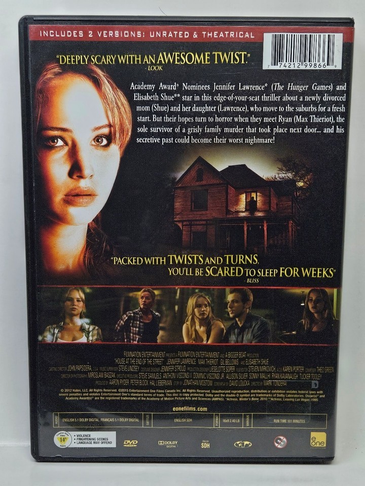 Immerse yourself in the suspenseful world of "House at the End of the Street," a thrilling horror film starring Academy Award winner Jennifer Lawrence, Max Thieriot, and Elisabeth Shue. This gripping DVD release features both the intense Unrated version and the Theatrical cut, offering viewers a choice in how they experience the chilling narrative.