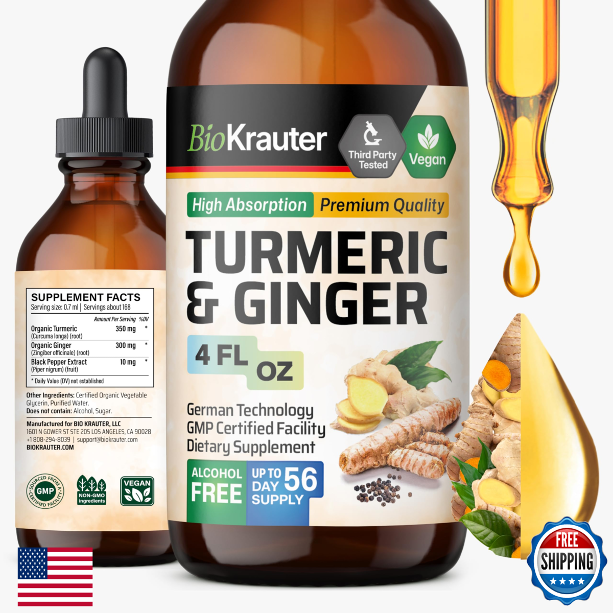 Ginger and Turmeric Supplements for Antioxidant Joint Support: BioKrauter liquid complex made from a blend of pure turmeric extract (Curcuma longa), ginger (Zingiber officinale), and black pepper extract (Piper nigrum), traditionally used to promote mobility and digestive support.,Vegan Non-alcohol: Our tumeric and ginger is vegan, non-GMO, and free from alcohol, artificial colors, and flavors, designed to align with a wide range of lifestyles.,No Bitter Taste: Liquid turmeric curcumin supplements by BioKrauter are crafted with glycerin, which naturally eliminates bitterness, ensuring a smooth and pleasant flavor without the need for any added sugars.,German Technology: We utilize German technology to craft a curcumin liquid that is naturally antioxidant. Made with only three simple ingredients: water, glycerin, and a blend of turmeric and ginger - this formula provides up to 98% absorption.,56 Days of Supply (Up to 2 Months): 4 fl oz bottle of of turmeric drops contains 168 servings (1 serving = 350 mg of turmeric (root), 300 mg ginger (root), 10 mg black pepper extract (fruit). Shake well before use. Add one (1) full squeeze of the lemon balm drink to 2 oz. of water or juice, three times daily.