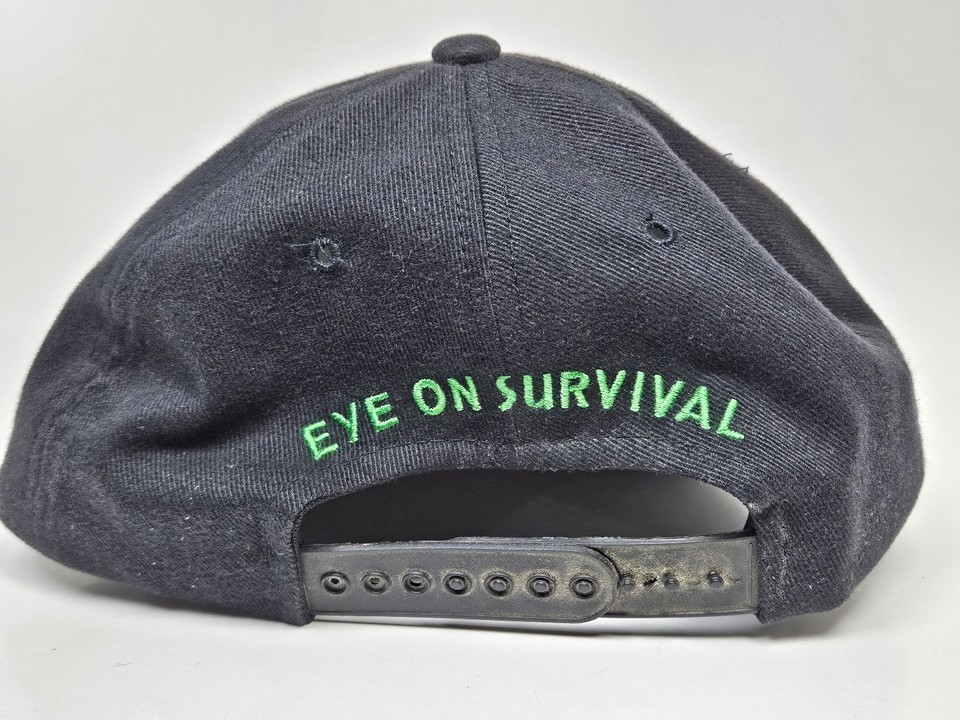 Discover the unique style of this Human-i-Tees "Eye On Survival" snapback hat. This striking black baseball cap features an intricately embroidered tiger face on the front, rendered in vibrant red, orange, white, and black threads, complete with piercing green and yellow eyes and green foliage details. The rear of the cap showcases "EYE ON SURVIVAL" embroidered in a bright green, complementing the environmental theme of the design.