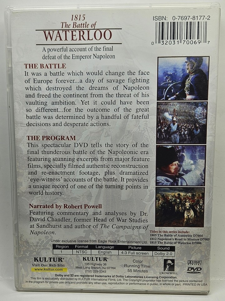 Immerse yourself in a powerful account of one of history's most pivotal moments with "1815 The Battle of WATERLOO" on DVD. This compelling documentary meticulously details the final defeat of Emperor Napoleon, bringing to life the savage fighting that forever changed the course of Europe. Narrated by the distinguished Robert Powell, the program features stunning excerpts from major feature films and specially filmed authentic reconstruction and re-enactment footage, providing a unique record of a turning point in world history. Expert commentary and analyses by Dr. David Chandler, former Head of War Studies at Sandhurst, enrich the narrative, offering deep insights into the tactical decisions and desperate actions that determined the outcome.