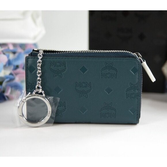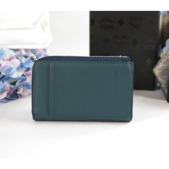MCM Klara Logo Embossed Deep Teal Leather Zip Card Case Mini Wallet NWT $495