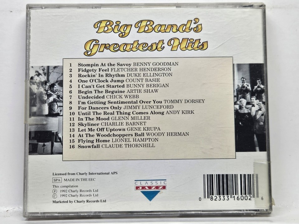 Step back into the golden age of swing with 'Big Band's Greatest Hits,' an essential compilation released by Charly Records in 1992. This collection features 16 definitive tracks from the masters of the genre, including Glenn Miller, Duke Ellington, Gene Krupa, Count Basie, and Benny Goodman. From the high-energy rhythms of 'In The Mood' to the sophisticated sounds of 'Stompin At the Savoy,' this disc serves as a comprehensive primer for any jazz enthusiast or collector of mid-century American music.