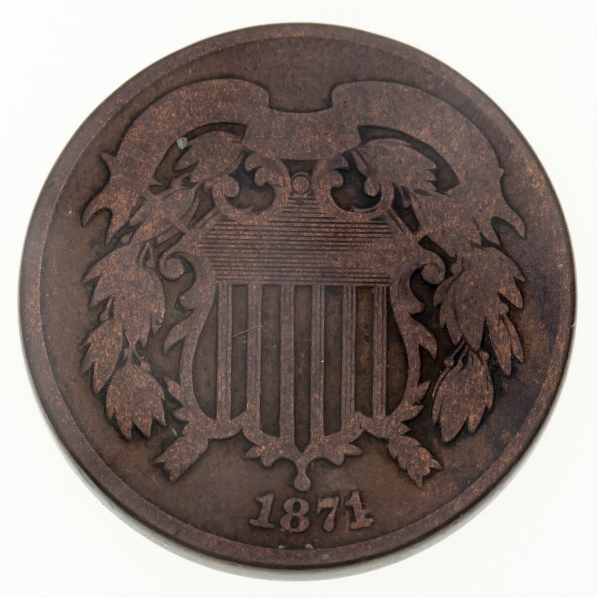 1871 Pieza de dos centavos en buen estado, color marron, llantas completas, sin problemas