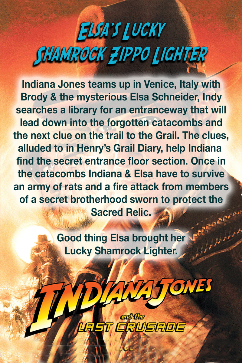 Indiana Jones teams up in Venice, Italy with Brody and the Mysterious Elsa Schneider. He searches a library for an Entranceway that will lead down into the Forgotten Catacombs and the Next Clue on the trail to the Holy Grail. The Clues, alluded to in Henry's Grail Diary, help Indiana find the Secret Entrance Floor Section. Once in the Catacombs Indiana and Elsa have to survive an army of rats and a fire attack from members of a Secret Brotherhood sworn to protect the Sacred Relic. Good thing Elsa brought her Lucky Shamrock Lighter.