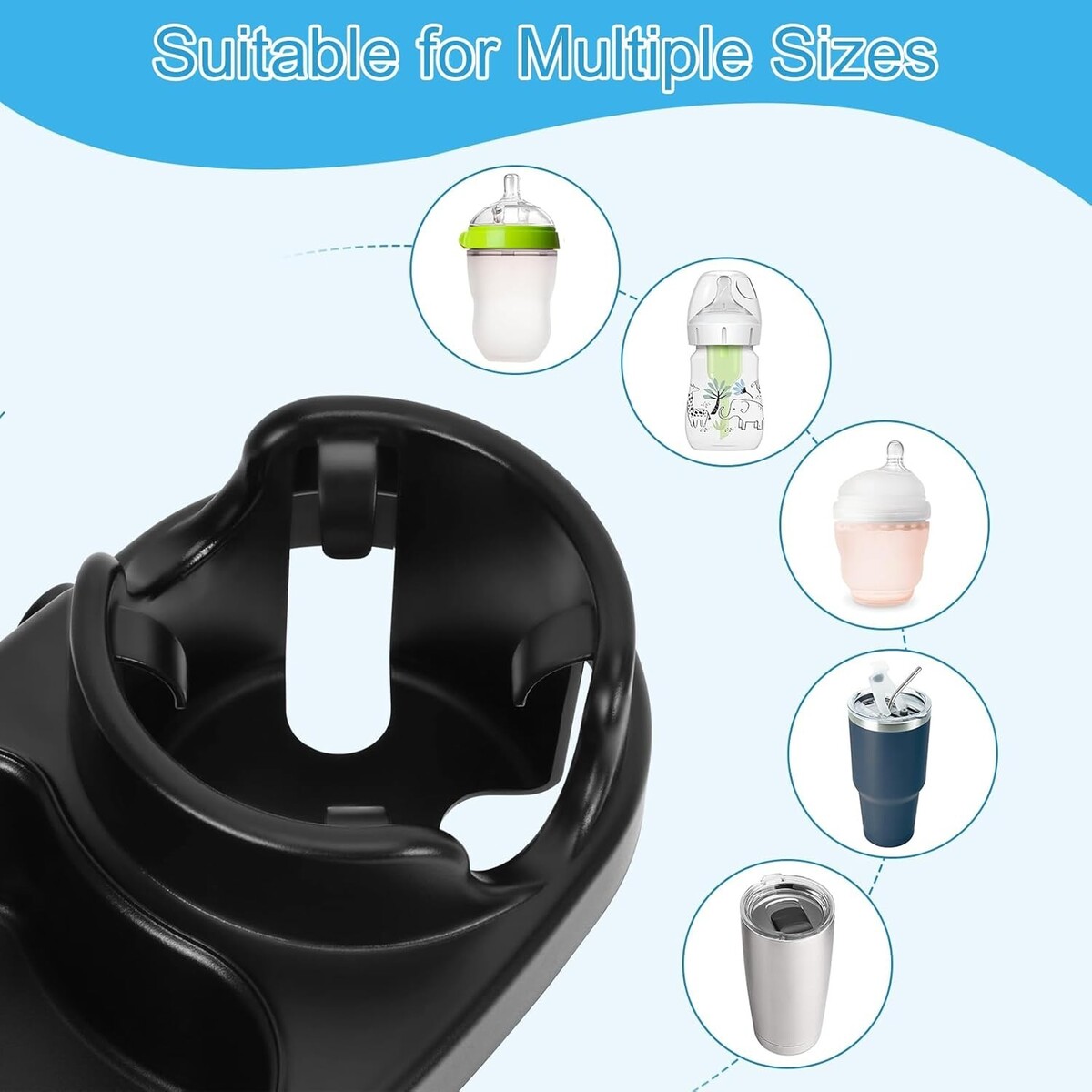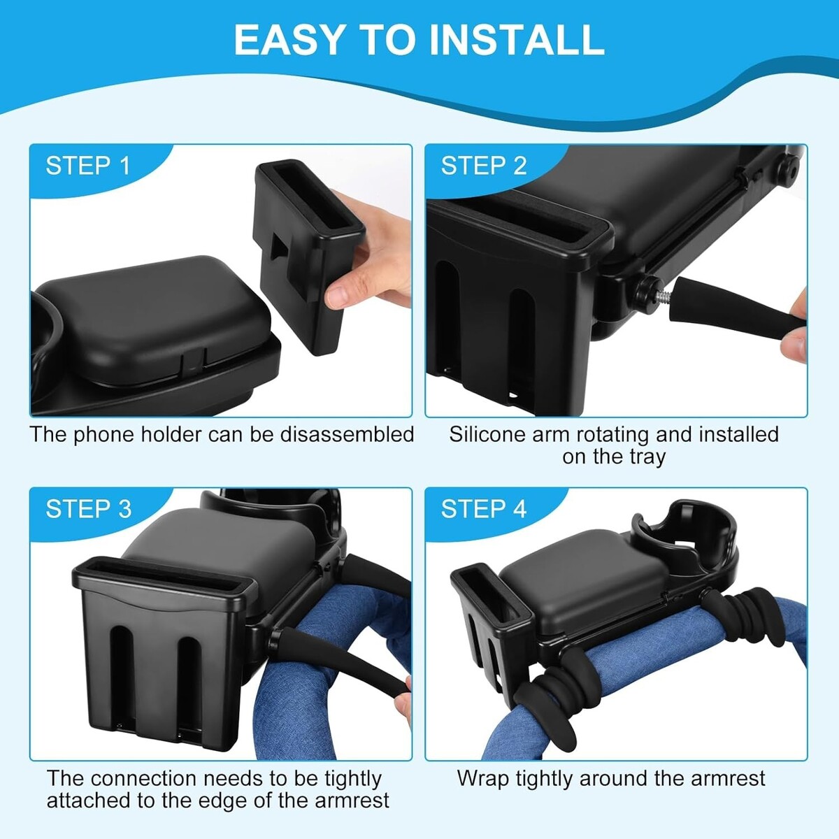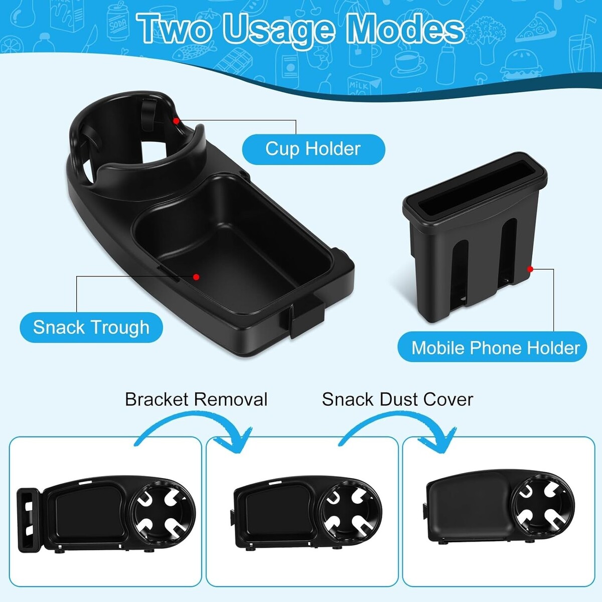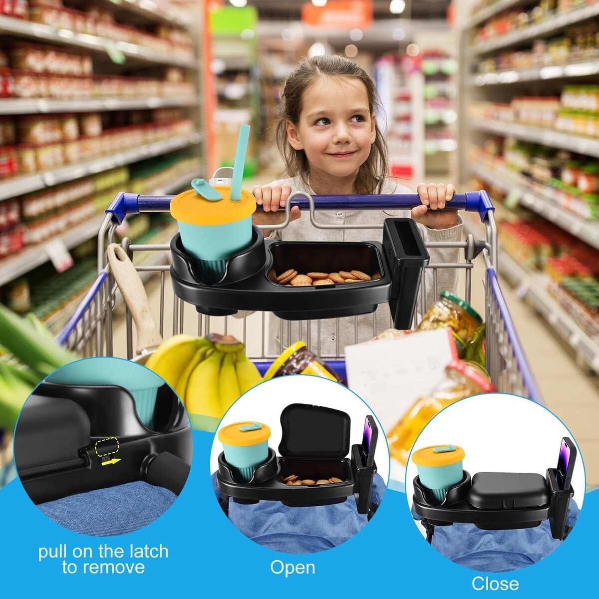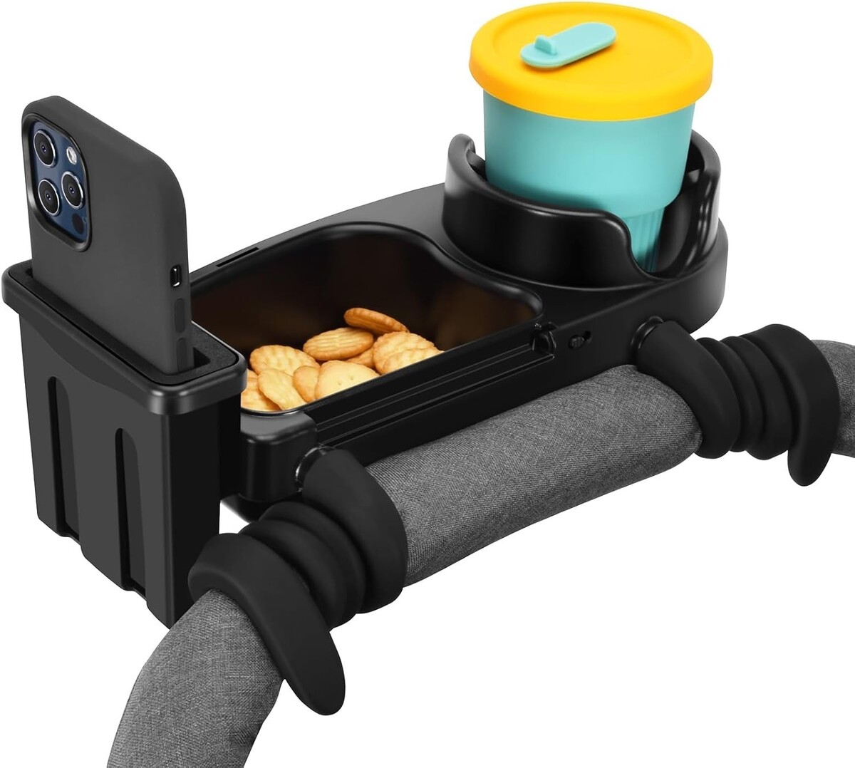 Universal Stroller Snack Tray Cup Holder Phone Rack Black with Silicone Flexible Arms Grip Detachable 3-in-1 Stroller Accessories