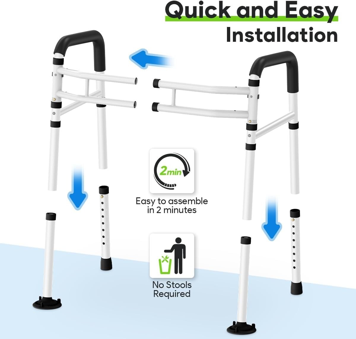 Enhance safety and comfort in your bathroom with our Non-Slip Toilet Assist Rail. Designed thoughtfully to support up to 300 lbs, it features easily adjustable height and width to ensure compatibility with practically any toilet. Forget the stress of complicated installations; it assembles in just five minutes, turning your bathroom into a haven of safety.