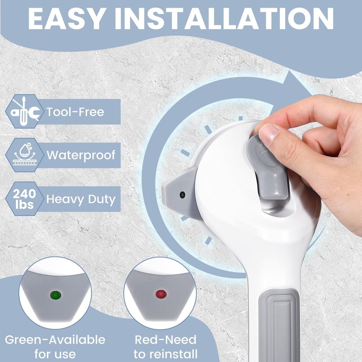 5-Second No-Drill Installation: Experience easy setup without tools or damaging your walls. Simply clean the surface, place the grab bar, and enjoy instant support.