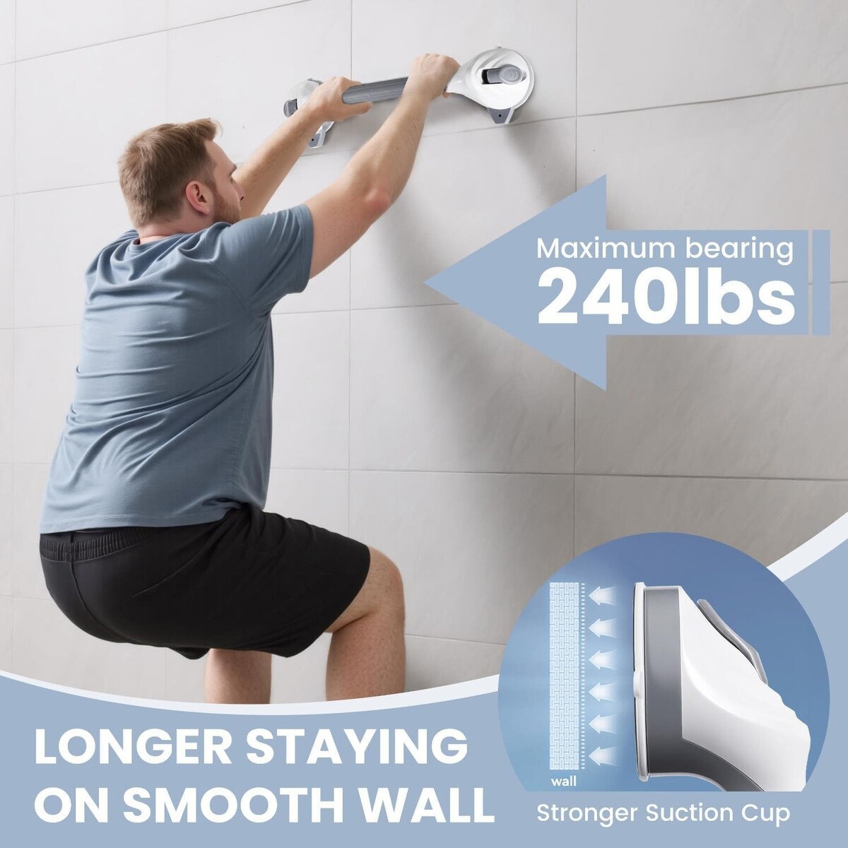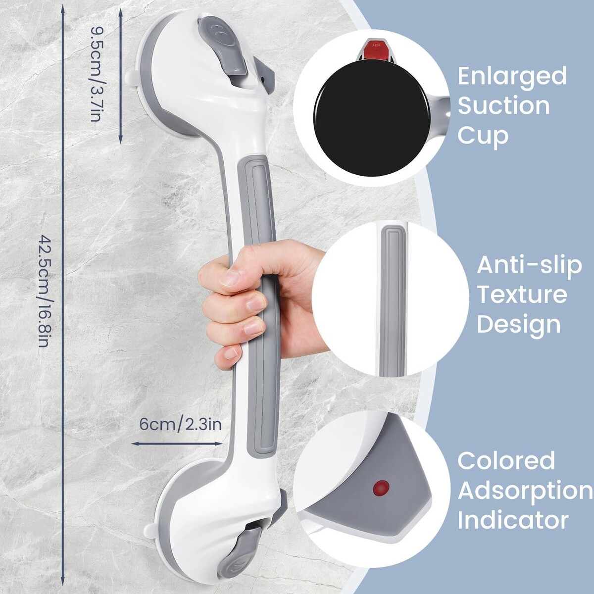 Non-Slip Safety Design: Designed with a secure grip in mind, our grab bars provide reliable safety, even in wet conditions. Large suction cups withstand significant force.