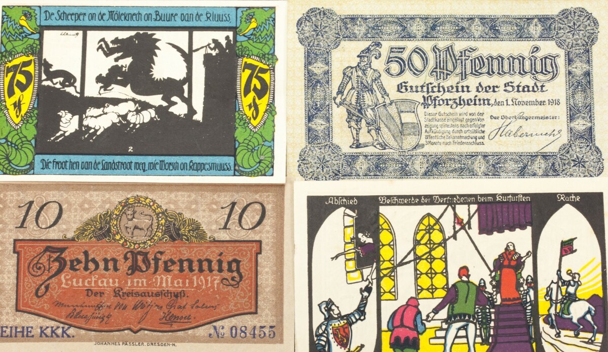 This lot will include 26 individual notgeld notes from Germany after World War I. All will be in Very Good to Almost Uncirculated (XF-UNC) condition. Face values between 5 pfennig to 5 mark.