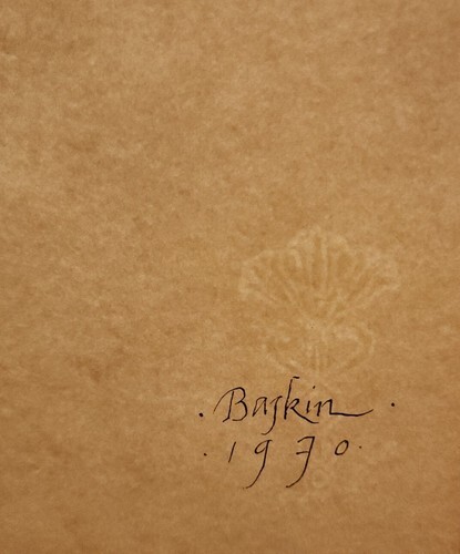 Baskin was distressed at the state of the art world when he made the drawings which were published in this portfolio. He said, ?The art of our time is an act of cowardice, a triumph of the trivial, a squandering of treasure.? In Baskin?s view, art was meant to be a means whereby ?man must rediscover man, harried and brutalized, distended and eviscerated, but noble withal, rich in intention, puissant in creative spur, and enduring in the posture of love.